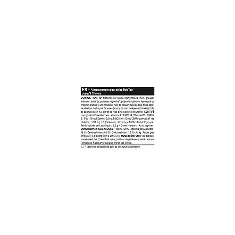 SANTE DE LA PEAU ET DU PELAGE : SHIH TZU JUNIOR aide à soutenir le rôle barrière de la peau (complexe exclusif), à maintenir une peau saine (EPA et DHA, vitamine A) et à nourrir le pelage. Enrichi en huile de bourrache.
